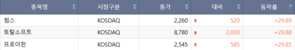 코스닥 시장에서는 핌스(29.89%), 토탈소프트(29.88%), 프로이천(29.85%) 등이 상한가를 기록했다. 디스플레이 관련주로 분류되는 핌스와 프로이천은 일진디스플과 같은 소식으로 상승한 것으로 보인다.