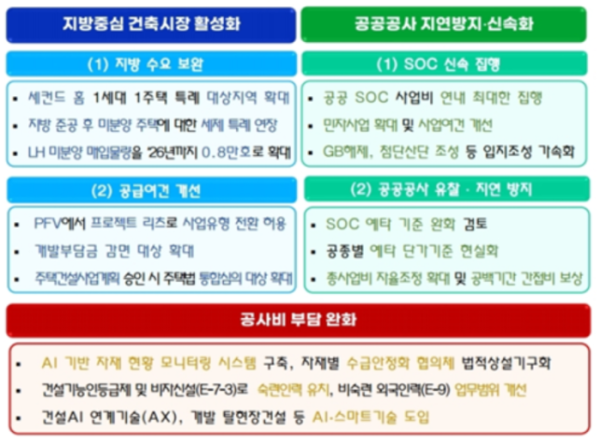 건설업계의 공사비 부담 완화를 위한 방안도 포함됐다. 레미콘, 철근 등 주요자재 수급안정화를 위해 인공지능(AI) 기반 모니터링 시스템을 구축하고, 바다골재 및 산림 토석 등 골재채취 인허가에 필요한 행정절차도 간소화한다. 건설현장의 인력난 완화를 위해, 기능인력(E-7-3) 비자 신설 등 해외인력의 현장활용을 지원하고, AI 경력설계 시스템 설계 등 기능인등급제 활성화도 지원한다. 아울러, 건설현장의 효율성 제고를 위해, AI·스마트 기술 도입을 적극 지원하고 관련 규제도 완화할 계획이다.