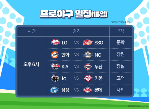 △8월 15일 프로야구 경기 일정- LG vs SSG (문학·18시)- 한화 vs NC (창원·18시)- KIA vs 두산 (잠실·18시)- kt vs 키움 (고척·18시)- 삼성 vs 롯데 (사직·18시)
