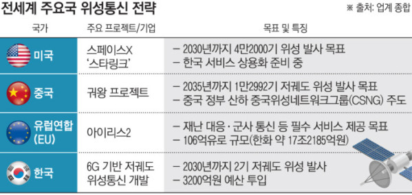 이에 비해 한국은 뒤처지고 있다는 평가다. 한국은 2030년까지 3200억 원을 들여 저궤도 통신위성 2기를 발사하는 것을 목표로 기술 확보에 나서고 있다. 그러나 대규모 자본과 인프라를 투입해 수천 기의 위성을 띄우는 주요국과 비교하면 턱없이 부족한 수준이다.