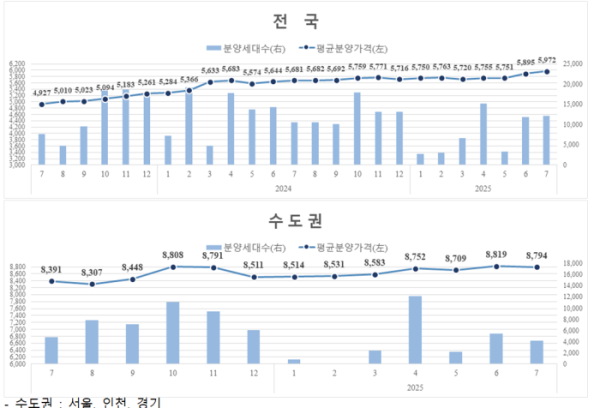 7월 전국 신규 분양 민간아파트 물량은 총 1만2186가구로 전년 동월 대비 1663가구 증가했다. 수도권은 4126가구, 5대 광역시와 세종시는 3923가구, 기타지방은 4137가구 신규 분양됐다.