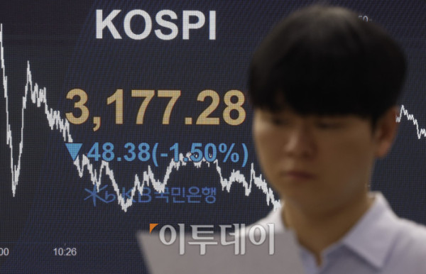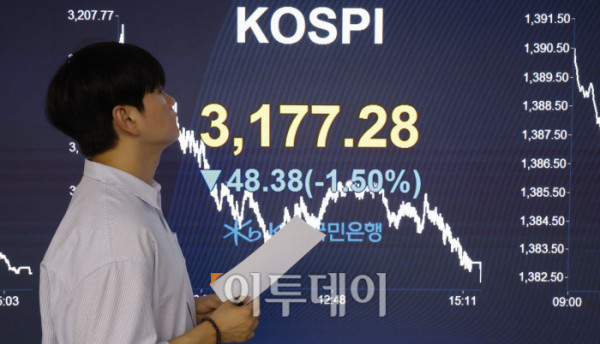▲코스피가 미국 금리인하 기대 후퇴와 관세 압박 영향으로 1% 이상 하락하며 3170선으로 마감한 18일 서울 영등포구 KB국민은행 딜링룸 전광판에 코스피가 표시돼 있다. 이날 코스피 지수는 전 거래일보다 48.38(1.50%) 포인트 하락한 3177.28을 나타냈다. 조현호 기자 hyunho@