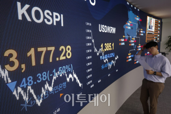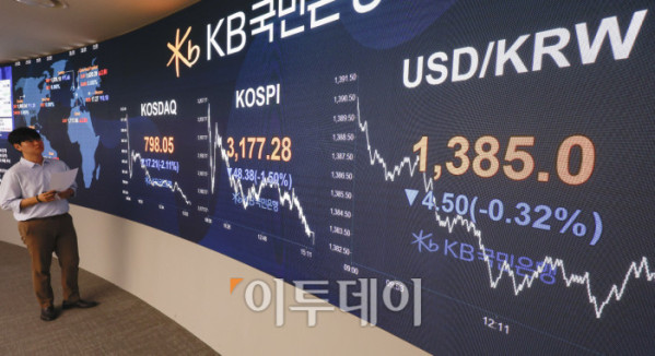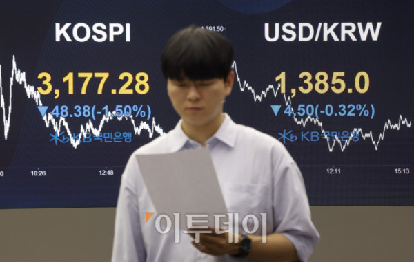 ▲코스피가 미국 금리인하 기대 후퇴와 관세 압박 영향으로 1% 이상 하락하며 3170선으로 마감한 18일 서울 영등포구 KB국민은행 딜링룸 전광판에 코스피, 원·달러 환율이 표시돼 있다. 이날 코스피 지수는 전 거래일보다 48.38(1.50%) 포인트 하락한 3177.28을 나타냈다. 원·달러 환율은 종가 기준 1385.1원을 나타냈다. 조현호 기자 hyunho@