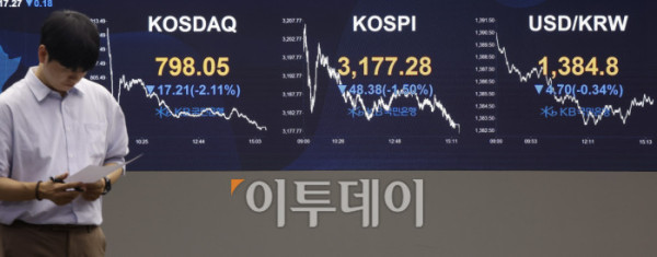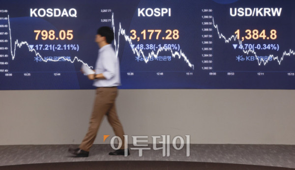 코스피가 미국 금리인하 기대 후퇴와 관세 압박 영향으로 1% 이상 하락하며 3170선으로 마감한 18일 서울 영등포구 KB국민은행 딜링룸 전광판에 코스피, 코스닥, 원·달러 환율이 표시돼 있다. 이날 코스피 지수는 전 거래일보다 48.38(1.50%) 포인트 하락한 3177.28을 코스닥 지수는 17.21(2.11%)포인트 하락한 798.05를 나타냈다. 원·달러 환율은 종가 기준 1384.8원을 나타냈다. 조현호 기자 hyunho@