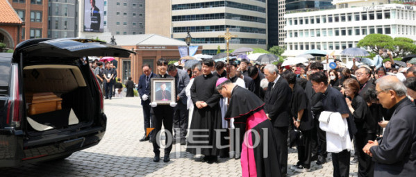 ▲故 유경촌 주교 장례 미사가 18일 서울 중구 명동대성당에서 엄수된 가운데 유인촌 전 문화체육관광부 장관을 비롯한 유가족들이 운구차를 향해 마지막 인사를 하고 있다. 사진공동취재단