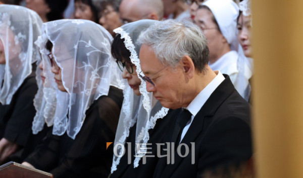 ▲유인촌 전 문화체육관광부 장관이 18일 서울 중구 명동대성당에서 엄수된 故 유경촌 주교 장례미사에서 슬픔에 잠겨 있다. 사진공동취재단