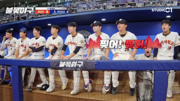 18일 오후 8시 유튜브 채널 ‘스튜디오시원(StudioC1)’을 통해 공개된 ‘불꽃야구’ 16화에는 동아대와의 생중계 경기 장면이 공개됐다.