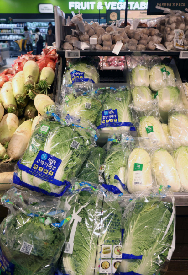 폭염과 폭우가 반복되는 이상기후 영향으로 배추 한 포기가 7000원을 넘어서는 등 채소 물가가 들썩이는 가운데 19일 서울의 한 대형마트에 배추가 진열되어 있다. 한국농수산식품유통공사(aT) 농산물유통정보에 따르면 18일 기준 배추 상품 기준 평균 소매가격은 7062원으로 1년 전(6463원)보다 9.3% 올랐다. 평년보다는 11% 높은 수준이고, 전달 대비 상승률은 52%에 달했다.