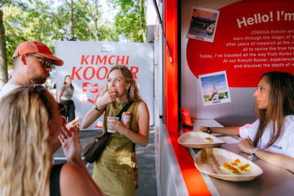 ▲대상 김치 브랜드 종가가 런던 대표 뮤직 페스티벌 ‘APE 2025’에서 운영한 부스 '테이스팅존'에서 외국인 방문객이 김치 요리를 맛보고 있다. (사진제공=대상)