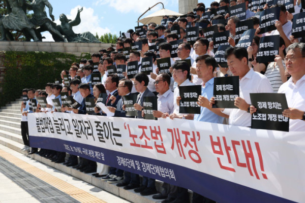경제6단체 및 경제단체협의회 회원들이 19일 서울 여의도 국회 본청 앞 계단에서 ‘노동조합법 개정안 수정 촉구 경제계 결의대회’를 갖고 있다.
