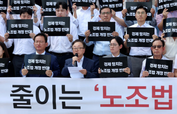 ▲이동근 한국경영자총협회 상근부회장이 19일 서울 여의도 국회 본청 앞 계단에서 경제6단체 및 경제단체협의회 회원들이 참석한 가운데 열린 ‘노동조합법 개정안 수정 촉구 경제계 결의대회’에서 발언하고 있다. 신태현 기자 holjjak@