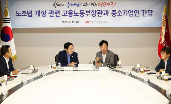 중소기업계는 19일 서울 여의도 중소기업중앙회에서 김영훈 고용노동부장관과 간담회를 개최했다. 업계는 정부와 여당의 노란봉투법(노동조합법 2·3조 개정안) 추진이 중소기업계에 '거래 단절' 등 심각한 타격을 안겨 기업의 경영 부담을 높일 것이라고 한 목소리를 냈다.