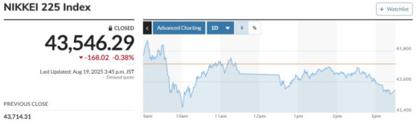 마켓워치에 따르면 일본증시 닛케이225지수(닛케이)는 전날보다 168.02포인트(0.38%) 하락한 4만3546.29엔으로 마감했다. 기술주 중심의 토픽스는 4.33포인트(0.14%) 내린 3116.63에 거래를 마쳤다.