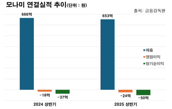 24일 금융감독원 전자공시시스템에 따르면 모나미는 올해 상반기 연결기준 24억 원의 영업손실을 기록해 지난해 상반기(-18억 원) 보다 손실폭이 확대됐다. 매출은 653억 원으로 지난해 같은 기간(666억 원)보다 1.95% 감소했고 당기순손실은 50억 원으로 작년 동기(37억 원) 대비 악화했다. 2분기 실적만 놓고 비교했을 때 지난해 같은 기간보다는 개선됐지만 올해 1분기에 비해선 악화됐다.