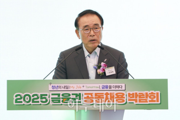▲조용병 은행연합회장이 20일 서울 중구 동대문디자인플라자(DDP)에서 열린 2025 금융권 공동채용 박람회 개막식에서 개회사를 하고 있다. 조현호 기자 hyunho@