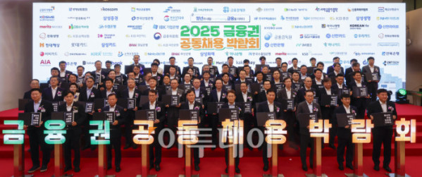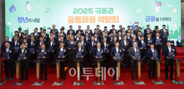 권대영(앞줄 왼쪽 여섯 번째) 금융위원회 부위원장과 윤한홍(앞줄 왼쪽 다섯 번째) 국회 정무위원회 위원장, 조용병(앞줄 왼쪽 여덟 번째) 은행연합회장 등 참석자들이 20일 서울 중구 동대문디자인플라자(DDP)에서 열린 2025 금융권 공동채용 박람회 개막식에서 기념촬영을 하고 있다. 조현호 기자 hyunho@