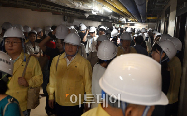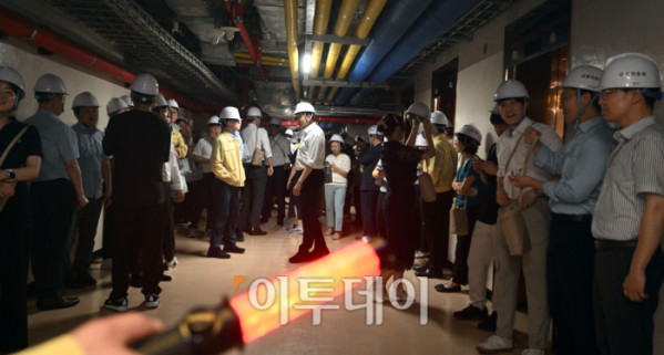 ▲20일 서울 종로구 정부서울청사에서 열린 2025년 8월 을지연습 연계 정부서울청사 공습대비 민방위 훈련에서 공무원들이 지하2층 대피장소로 이동해 대기하고 있다. 조현호 기자 hyunho@