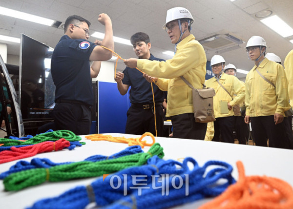김민석 국무총리가 20일 서울 종로구 정부서울청사에서 열린 2025년 8월 을지연습 연계 정부서울청사 공습대비 민방위 훈련에서 매듭법을 배우고 있다. 조현호 기자 hyunho@