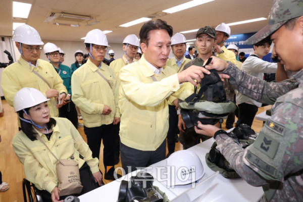 ▲김민석 국무총리가 20일 서울 종로구 정부서울청사에서 열린 2025년 8월 을지연습 연계 정부서울청사 공습대비 민방위 훈련에서 비상상황시 방독면 착용법을 배우고 있다. 조현호 기자 hyunho@