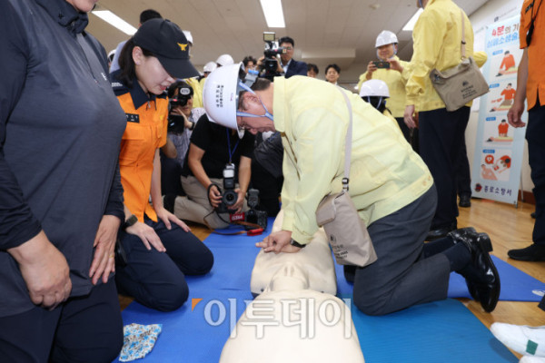 ▲김민석 국무총리가 20일 서울 종로구 정부서울청사에서 열린 2025년 8월 을지연습 연계 정부서울청사 공습대비 민방위 훈련에서 심폐소생술(CPR) 실습을 하고 있다. 조현호 기자 hyunho@