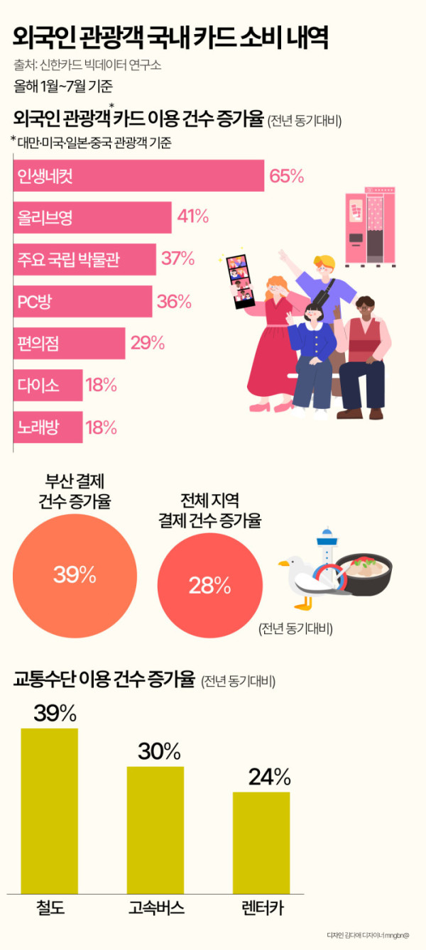 인생네컷, 박물관, 올리브영 등에서 외국인 관광객의 카드 이용 건수가 급증한 것으로 나타났다.