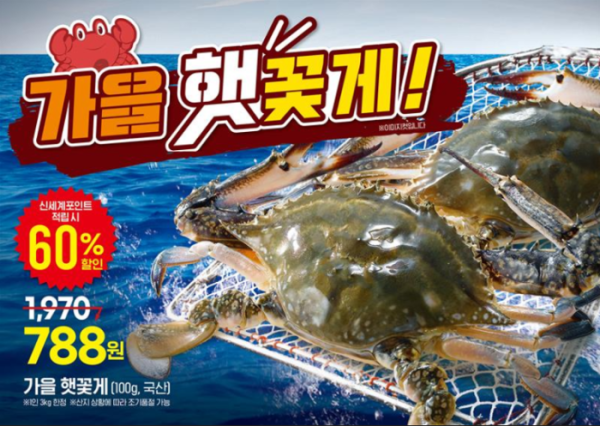 금어기 해제 직후 어획한 살아있는 꽃게를 5도씨 이하 냉수로 기절시킨 뒤 톱밥에 포장해 포구에서 직송한 가을 햇꽃게로, 통통하게 살이 올라 속이 꽉 찬 것이 특징이다. 22일부터 24일까지 ‘빙장 햇꽃게(100g)’도 일부 카드 결제 시 50% 할인한 790원에 내놓는다.