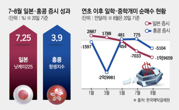 일학개미(일본 증시에 투자하는 국내 투자자)와 중학개미(중화권 증시에 투자자하는 국내 투자자)는 이번 상승장을 차익실현 기회로 삼고 있다. 일학개미의 경우 지난달 7033만 달러를 순매도한 데 이어 이달 들어서는 1억9659만 달러어치를 팔며 매도 우위를 지속했다.
