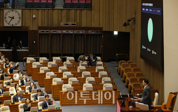 ▲22일 서울 여의도 국회에서 열린 본회의에서 노동조합 및 노동관계조정법 일부개정법률안(노란봉투법)이 통과되고 있다. 고이란 기자 photoeran@