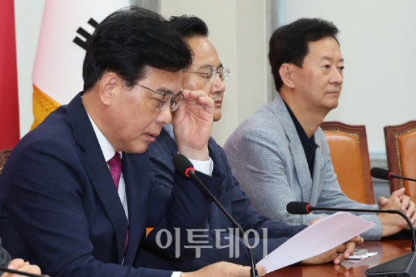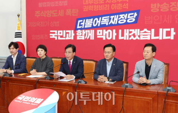 송언석 국민의힘 비상대책위원장 겸 원내대표가 24일 서울 여의도 국회에서 현안 관련 기자간담회를 하고 있다. 고이란 기자 photoeran@