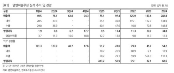 엠앤씨솔루션은 올해 2분기 매출액 974억 원, 영업이익 134억 원을 기록했다. 전년 동기 대비 각각 28.0%, 56.9% 증가한 수준이다. 수출 비중은 국내 지상무기 정비 및 유도무기 양산 증대에도 48.9%를 기록했다. 배성조 한화투자증권 연구원은 "영업 레버리지 효과가 나타나고 있다"고 평가했다.