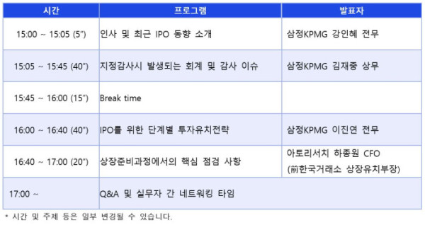 첫번째 세션으로 삼정KPMG 강인혜 전무가 국내외 IPO 시장 동향과 전망을 설명하고, 두 번째 세션에서는 삼정KPMG 김재중 상무가 지정감사 절차상의 회계·감사 이슈와 재무제표 작성 유의사항, IFRS 적용 시 업종별 고려사항, 감사 대응 전략을 제시한다.