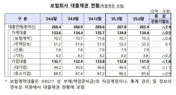 금융감독원이 25일 발표한 ‘2025년 6월 말 보험회사 대출채권 현황’에 따르면 보험사 전체 대출채권 잔액은 265조4000억 원으로 집계됐다. 전 분기 말보다 2조4000억 원 감소한 수치다.