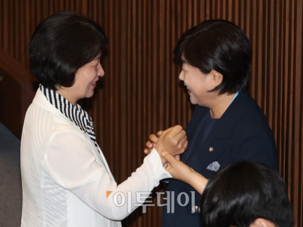 ▲추미애(왼쪽) 더불어민주당 의원이 25일 서울 여의도 국회에서 열린 본회의에서 서영교 의원과 대화하고 있다. 고이란 기자 photoeran@