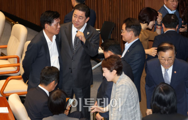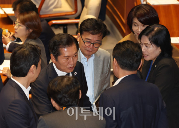 ▲정청래 더불어민주당 대표가 25일 서울 여의도 국회에서 열린 본회의에서 김병기 원내대표, 동료 의원들과 대화하고 있다. 고이란 기자 photoeran@
