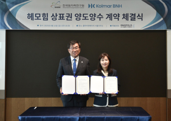 ▲(왼쪽부터)주한규 한국원자력연구원 원장, 윤여원 콜마비앤에이치 대표가 22일 서울 서초구 서초동에 있는 콜마비앤에이치 서울사무소에서 진행된 ‘헤모힘 상표권 양수 계약 체결식’에서 기념사진을 촬영하고 있다. (사진제공=콜마비앤에이치)