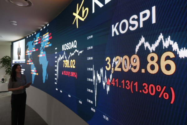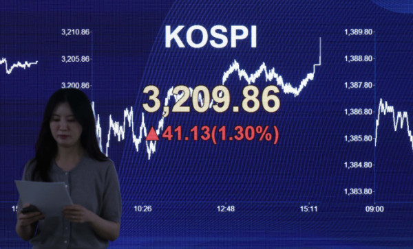 미국 금리 인하 기대감에 코스피가 3200선을 탈환한 25일 서울 여의도 KB국민은행 스마트딜링룸 모니터에 코스피 종가가 표시되고 있다. 이날 코스피는 전일 대비 41.13p(1.30%) 오른 3209.86에 장을 마쳤다.