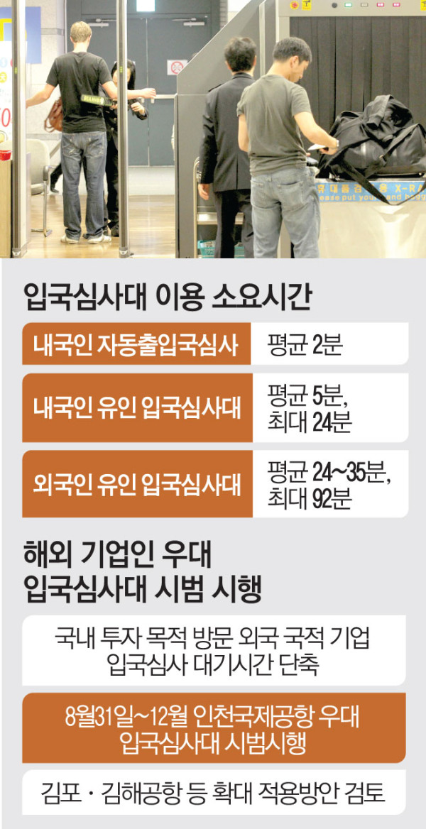 현재 우리 국민은 자동 출입국심사 이용 시 평균 2분 내외, 내국인 대상 유인 입국심사대 이용 시 평균 5분에서 최대 24분이 걸린다.
