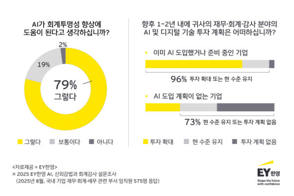 26일 EY한영이 발표한 '2025 EY한영 AI, 신외감법과 회계감사 설문조사'에 따르면 응답자의 95%는 재무·회계·감사 업무에서 AI 도입이 필요하다고 답했다. 97%는 AI 도입에 관심이 있다고 응답해 대다수의 국내 재무·회계·감사 업무 종사자들이 AI의 필요성과 중요성을 인식하고 있는 것으로 나타났다.