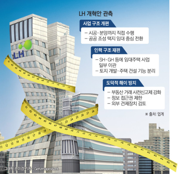 이번 개혁에서 LH의 확대된 업무 범위를 정리할지도 관건이다. LH는 그동안 신규 택지개발, 주택 공급에 지방 미분양 주택 매입, 전세사기 피해자 지원까지 방대한 업무를 담당했는데, 일부 기능을 지방 공기업이나 타 기관으로 이관할 수 있다는 관측이다. 특히 임대주택 공급의 경우 SH·GH 등 지방 공기업과 분담할 것으로 보인다. 이밖에 토지 개발과 주택 건설·운영 등 핵심 기능을 분리해 LH의 업무 효율성을 높일 수 있다는 전망도 나온다.