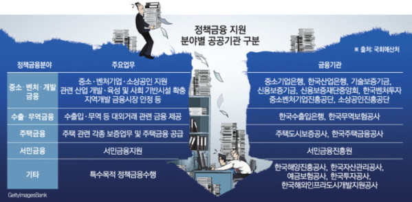 현재 한국산업은행, 한국수출입은행, 한국주택금융공사(HF), 기술보증기금 등 18개 금융 공공기관은 각각 다른 부처 아래 흩어져 유사한 기능을 반복적으로 수행하며 경쟁적으로 정책금융을 쏟아내고 있다. 이 과정에서 협업은 사라지고 칸막이 행정과 실적 부풀리기만 남아 정책금융이 본연의 역할을 상실했다는 지적이 제기된다.