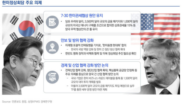 삼정KPMG 경제연구원은 "이번 한미 정상회담으로 불안 요인들이 완화되고, 조선·에너지·방산 등 전략 산업의 협력 기회 마련 등 긍정적 영향이 확대된 만큼, 한국 기업은 첨단 기술 협력과 핵심광물 공급망 안정화 논의 속에서 성장 동력을 모색해야 한다"며 "특히 1500억 달러 규모 대미 투자 실행 과정에 대한 후속 모니터링과 새로운 비즈니스 기회 발굴이 필요하다"고 강조했다.