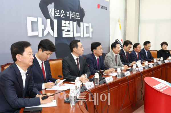 ▲장동혁(가운데) 국민의힘 대표와 송언석(왼쪽) 원내대표를 비롯한 최고위원단이 27일 서울 여의도 국회에서 열린 최고위원회의에 참석하고 있다. 고이란 기자 photoeran@