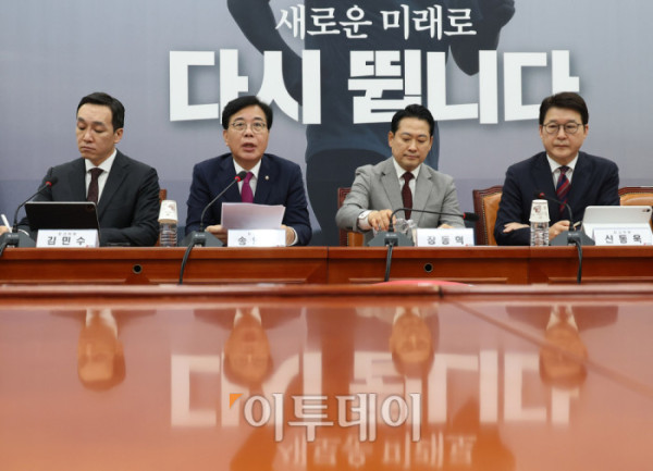 ▲송언석 국민의힘 원내대표가 27일 서울 여의도 국회에서 열린 최고위원회의에서 발언을 하고 있다. 고이란 기자 photoeran@