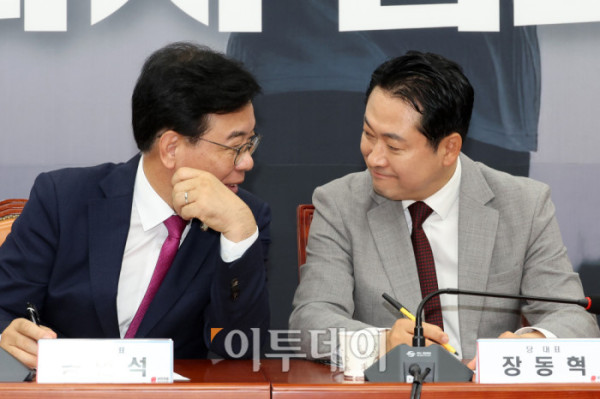 ▲장동혁(오른쪽) 국민의힘 대표와 송언석 원내대표가 27일 서울 여의도 국회에서 열린 최고위원회의에서 대화하고 있다. 고이란 기자 photoeran@