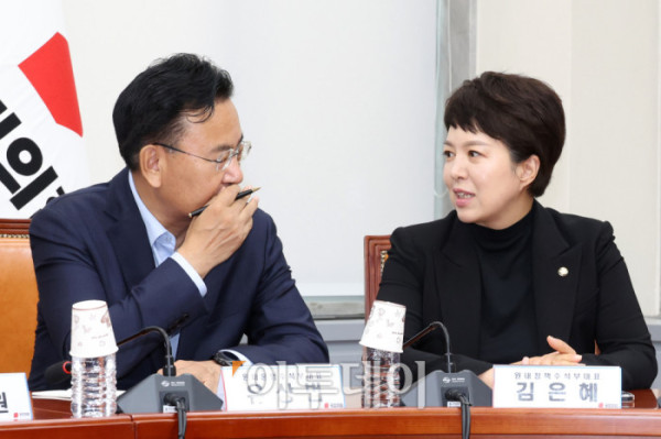 ▲유상범(왼쪽) 국민의힘 원내운영수석부대표와 김은혜 원내정책수석부대표가 27일 서울 여의도 국회에서 열린 최고위원회의에서 대화를 하고 있다. 고이란 기자 photoeran@