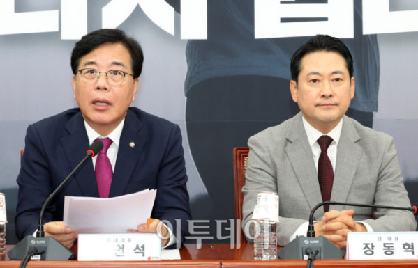 ▲송언석 국민의힘 원내대표가 27일 서울 여의도 국회에서 열린 최고위원회의에서 발언을 하고 있다. 오른쪽은 장동혁 대표. 고이란 기자 photoeran@