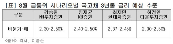 한국은행 8월 금융통화위원회가 매파(통화긴축적)나 비둘기파(통화완화적) 중 어떤 결정을 내놓더라도 채권시장엔 큰 영향을 미치기 어렵다는 전망이 나왔다.