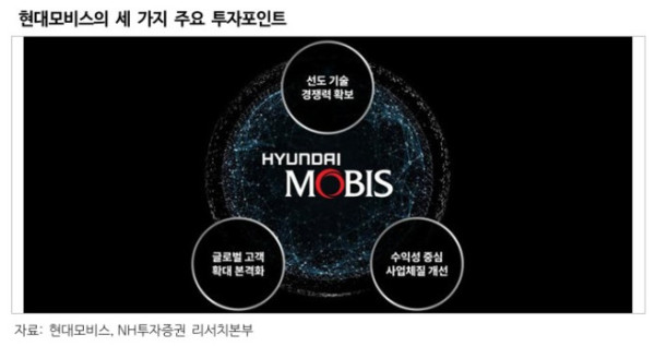 전날 현대모비스는 CEO 인베스터데이를 개최해 회사의 부문별 전략 방향, 중장기 재무전략 계획 등을 발표했다. 하늘 NH투자증권 연구원은 "자동차 산업의 중심이 SDV로 전환함에 따라 새로운 기술을 제품화할 수 있는역량이 중요해지며 차별화된 기술을 선행 개발해 완성차에 제시하는 추세로 변화하고 있다"며 "현대모비스가 보유한 기술적 역량과 현재 집중하고 있는 차세대 부품에 대한 향후 계획을 구체적으로 발표했다"고 말했다.