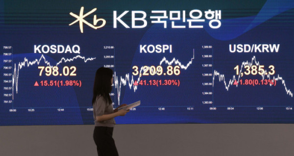 ▲미국 금리 인하 기대감에 코스피가 3200선을 탈환한 25일 서울 여의도 KB국민은행 스마트딜링룸 모니터에 코스피 종가가 표시되고 있다. 이날 코스피는 전일 대비 41.13p(1.30%) 오른 3209.86에 장을 마쳤다. 신태현 기자 holjjak@