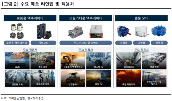 하이젠알앤엠은 로봇용 액추에이터 전문 기업으로 범용 전동기, 서보 모터, 드라이브 등 로봇과 관련한 동력 전달 및 모션 제어 제품을 생산한다. 올해 상반기 매출액 비중은 범용모터 80.4%, 서보모터/드라이브 15.1% 등이다.